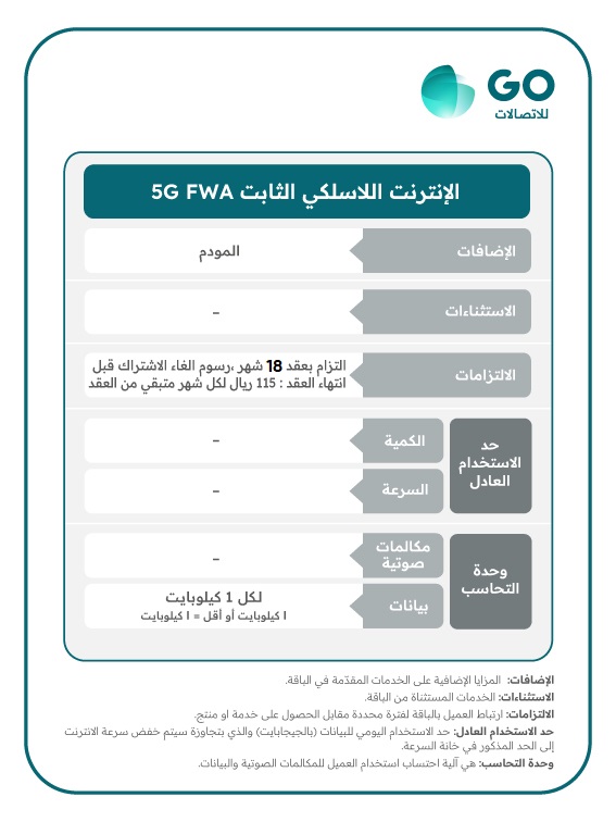 * رسوم الإنهاء المبكر للعقد: 115 ريال شاملة الضريبة عن كل شهر متبقي في عقد الالتزام. * يجب دفع مبلغ تأمين يعادل قيمة شهر من قيمة الإشتراك لتفعيل الخدمة. * سيتم رد مبلغ التأمين مقابل فاتورة الشهر الثالث من العقد.